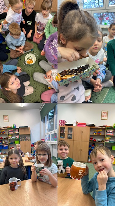 15 grudnia oddział przedszkolny C świętował Dzień Herbaty. Przenieśliśmy się w pachnący, zimowy klimat. Dzieci przygotowywały zimową herbatę, poznając różne dodatki, takie jak przyprawy, owoce i zioła. Mogły je swobodnie powąchać, dotknąć i zobaczyć z bliska, odkrywając nowe zapachy i faktury. Było to radosne, pyszne i sensoryczne doświadczenie, które pobudziło ciekawość oraz zmysły dzieci.